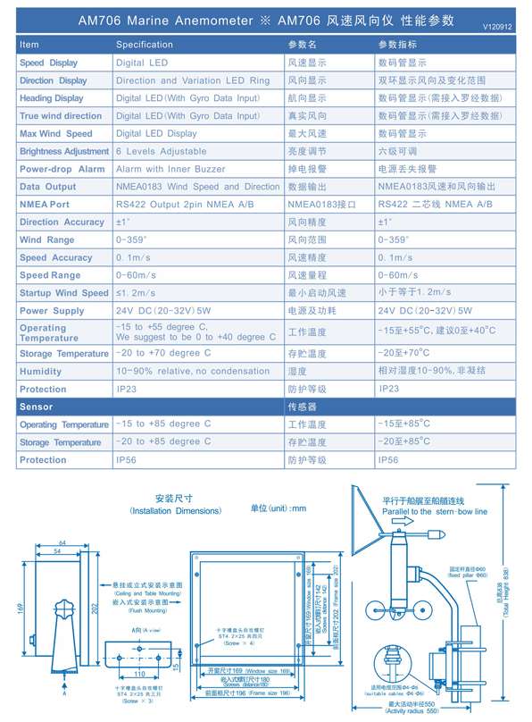 The Marine Anemometer AM706 is a combined instrument for wind speed and wind direction. It can measure relative wind speed (accuracy ±5%), relative wind direction (display accuracy 10 °, output accuracy ± 1 °). With inputting GPS (RMC) data, user can choose heading, true wind, or gust mode.