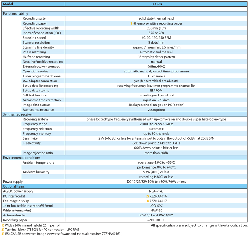 The received fax broadcasts are recorded on thermal recording paper in a solid-state recording environment, using a thermal head. JRC integrated an automatic frequency selection, allowing for optimized receiving. The JAX-9B can receive in four different modes.