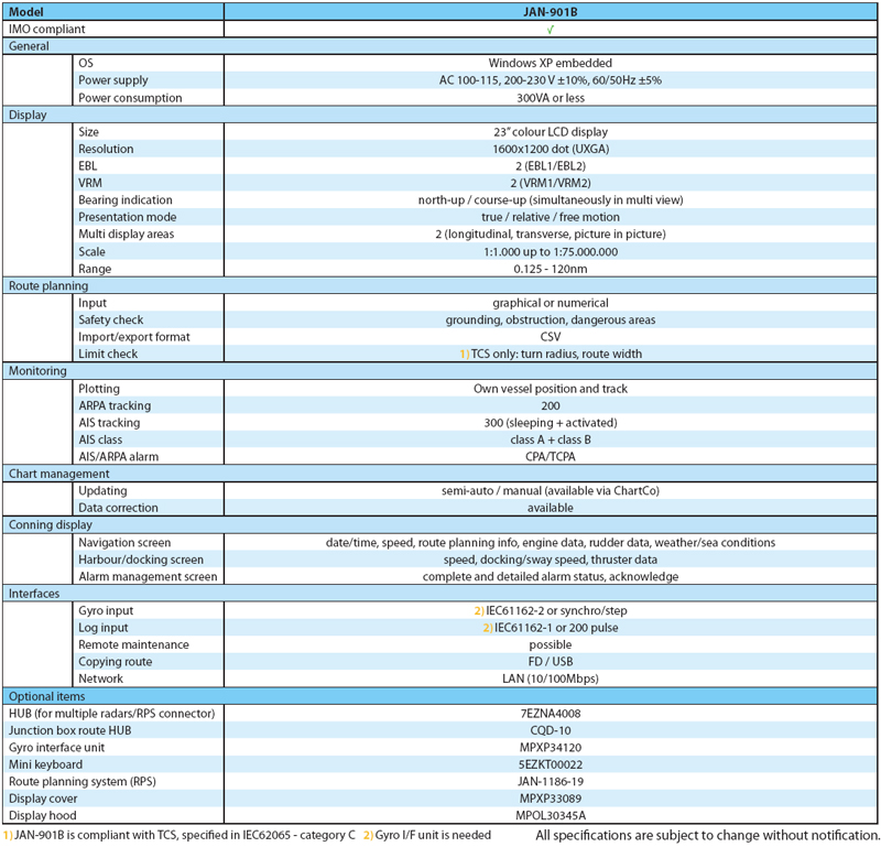 The JAN-901B is a newly developed multi-functional ECDIS. It is ergonomically designed to enhance the working environment and man/machine interfaces, providing continuous position and navigational safety information.