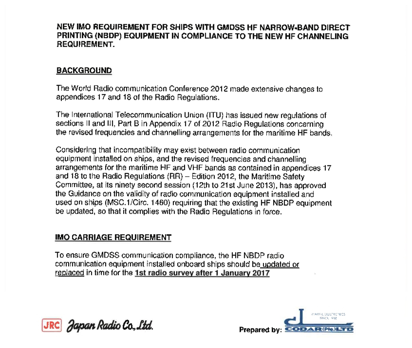 >NEW IMO REQUIREMENTS FOR SHIPS WITH GMDSS HF NBDP EQUIPMENT INSTALLED ON BOARD